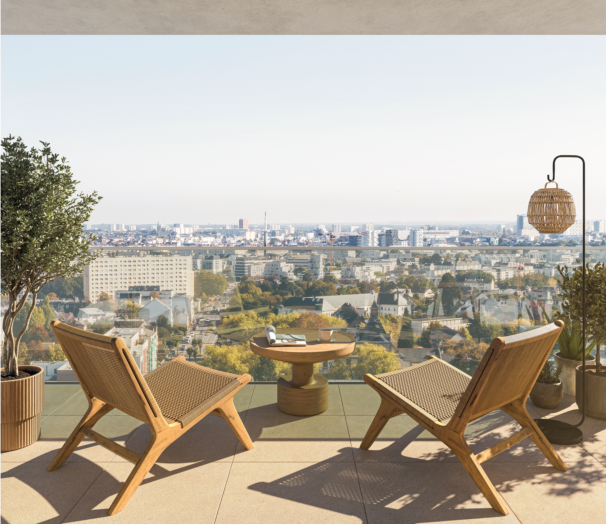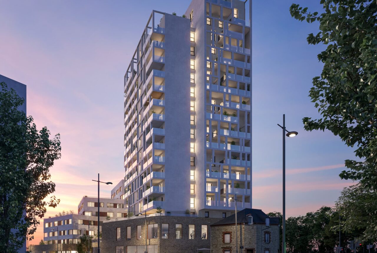 Ce projet répond aux exigences réglementaires et de la certification NF HABITAT HQE. Il déploie ses 17 étages proposant 73 logements du T2 au T4 très bien orientés et très lumineux; chaque logement a une ou plusieurs grandes loggias intimes ouvrant des vues dégagées sur Rennes.